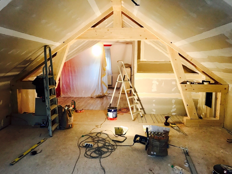 Pour une extension qui entrait dans la toiture existante, il fallait mettre un poteau pour reprendre les charges de toiture. Mais à la place nous avons construit une belle structure en lamellé-collé, qui ne gène pas le passage.