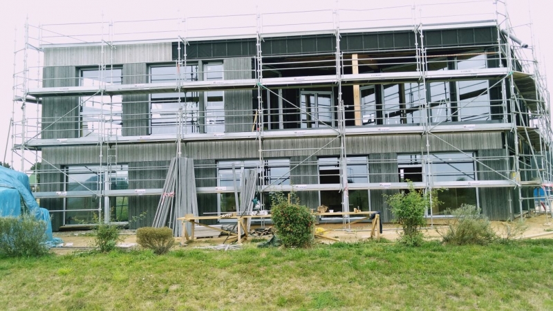 Nous avons commencé le bardage sur notre chantier des bureaux. Nous avons fabriqué le bardage en 3 largeurs. Chaque largeur a 3 teintes de gris argenté, fabriqué par ADLER. Le côté apparent du bardage est brut, afin que la peinture se tienne mieux. Pour la deuxième couche, nous la poserons sur le chantier, pour cacher les vis.
