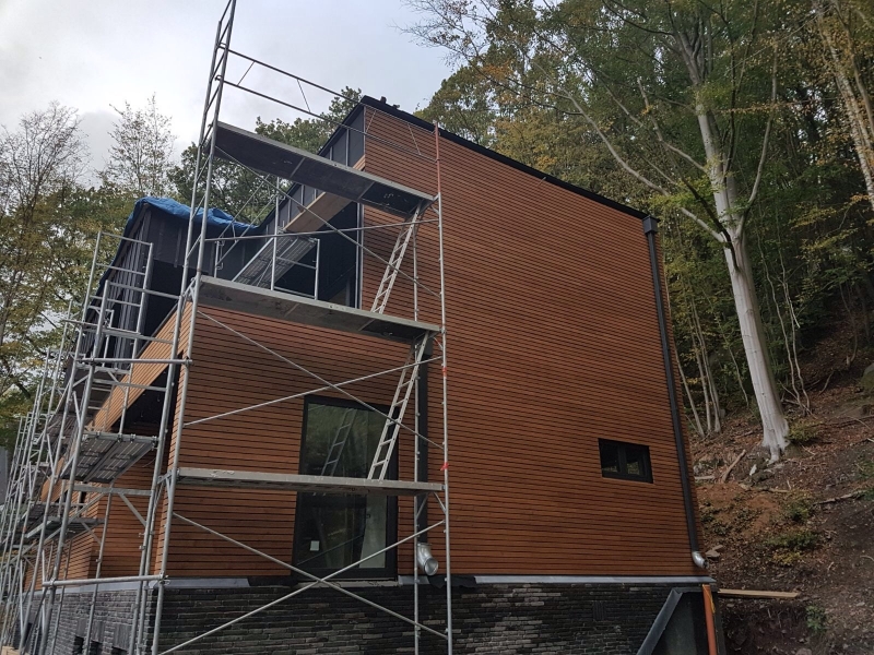 Chantier presque fini en Belgique Nous avons presque fini le chantier à Ham-sur-Heure. Tout était sur mesure: le bardage, les fenêtres, les finitions de fenêtres, le plafond en plusiers niveaux.