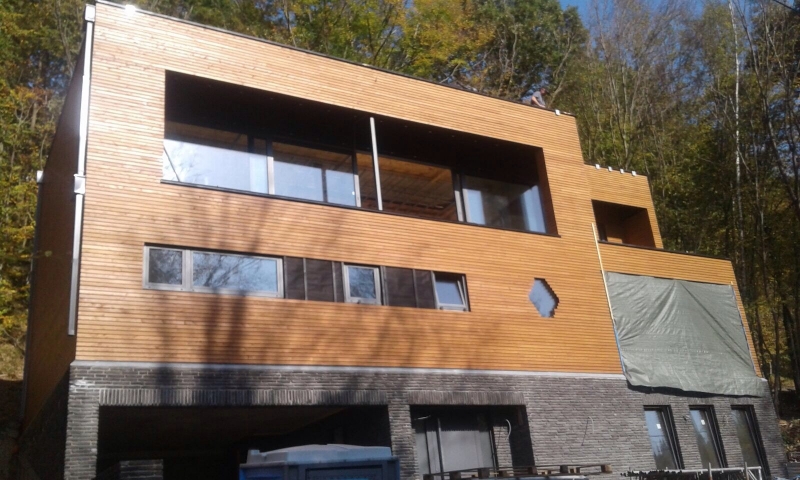 Nous avons fini la façade de la maison en Belgique. Trois hommes ont travaillé 6 semaines sur la façade : découper les planches pour ne pas avoir de noeux, joindre tous les angles à 45 degrés, visser avec des vis en bronze, et repeindre la 2e couche de peinture.
