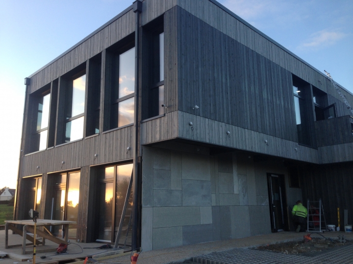 Panneaux de façade en fibre ciment, Baden Nous sommes en train de poser les panneaux en fibre ciment pour une partie de la façade. La division de panneaux était faite sur mesure.