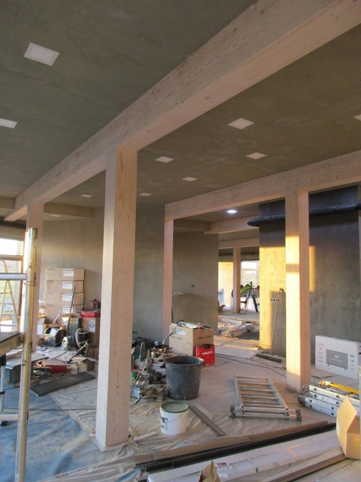 Finitions intérieures, Baden Nous avons fini l'intérieur de notre chantier à Baden. Toute la structure porteuse en lamellé-collé était laissée apparente et blanchie. Les murs étaient finis pour donner un effet béton.