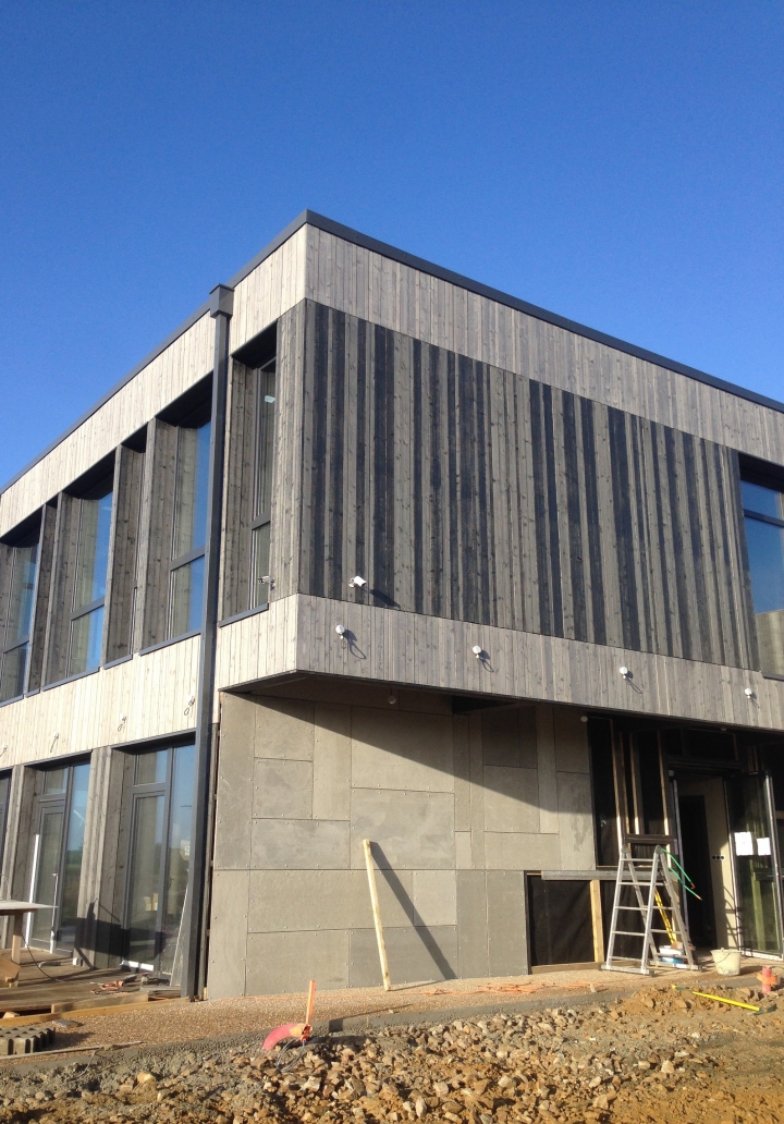 Façade mélangée, France La façade à Baden était finie avec deux types de matériaux : bois brut en trois teintes et panneaux ciment.