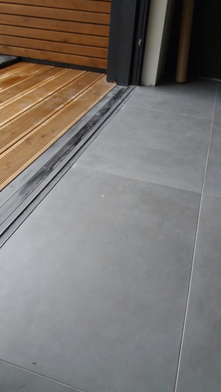 Nous avons fini la pose du carrelage en Belgique. La partie de terrasse est mieux isolée que le plancher intérieur, mais la construction était faite pour qu'il n y a pas de marches. Et le profil de fenêtres ALU était intégré dans le sol pour pas avoir de seuil.