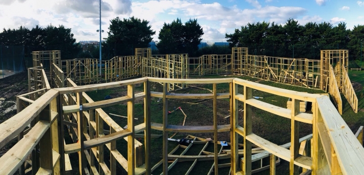 Ossature porteuse posée, France La construction périphérique est finie. L'ouverture du parc de paintball est prévue en mars 2018.