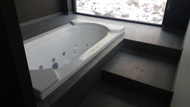 Carrelage fini, Belgique Carrelage finie, aussi pour une baignoire au niveau de rebord de fenêtres, selon les plans de l'architecte.