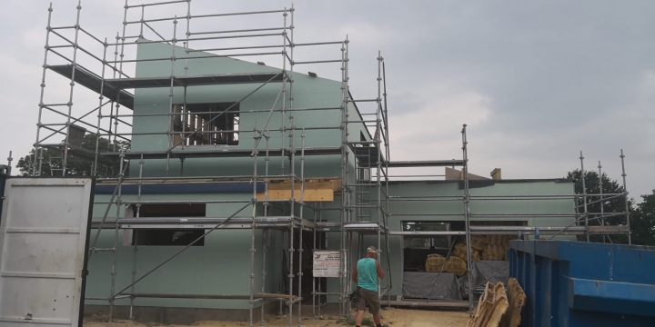 Panneaux façade, France Sur l'ossature de murs extérieurs nous posons de panneaux traités KNAUF KTS GKBI, qui protègent de la humidité et améliore la résistance au feu, en gardant les murs perspirants.