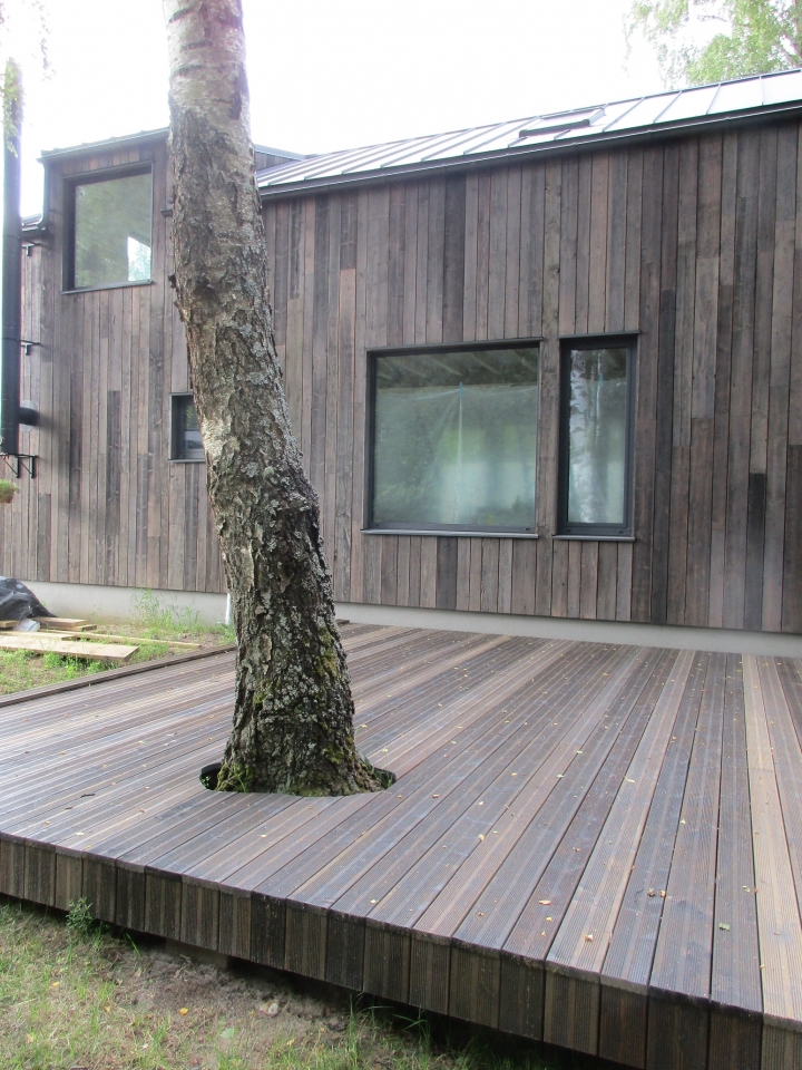 Terrasse en mélèze de Sibérie, huilée, Lettonie Les planches de terrasse sont en différentes largeurs et huilées en trois teintes, comme la façade.
