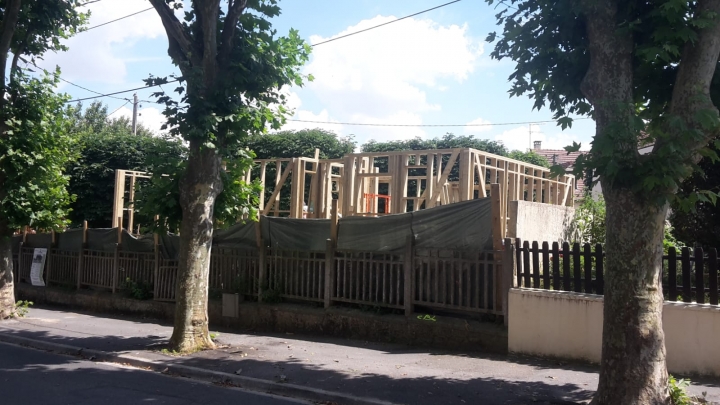 Ossature de RDC finie , Gousainville La construction de l'ossature porteuse de RDC était faite en 3 jours. Toujours en épicéa nordique, classe mécanique C24, autoclave.