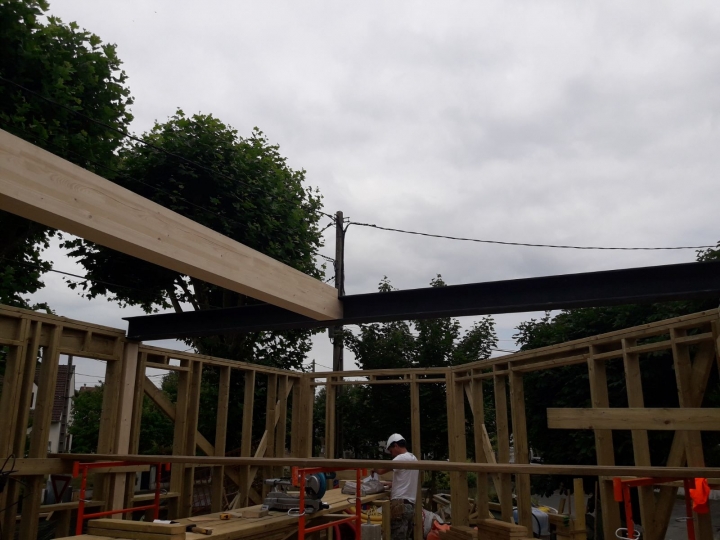 poutre métallique intégrée, Gousainville Pour une grande portée du plancher, nous avons intégré une poutre métallique avec une poutre lamellé-collé pour supprimer les poteaux.