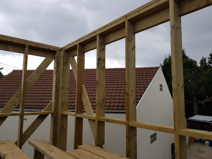 Contreventment intégré, Gousainville Les murs extérieurs ont de montants horizontaux et diagonales, tranversant toute l'ossature.
