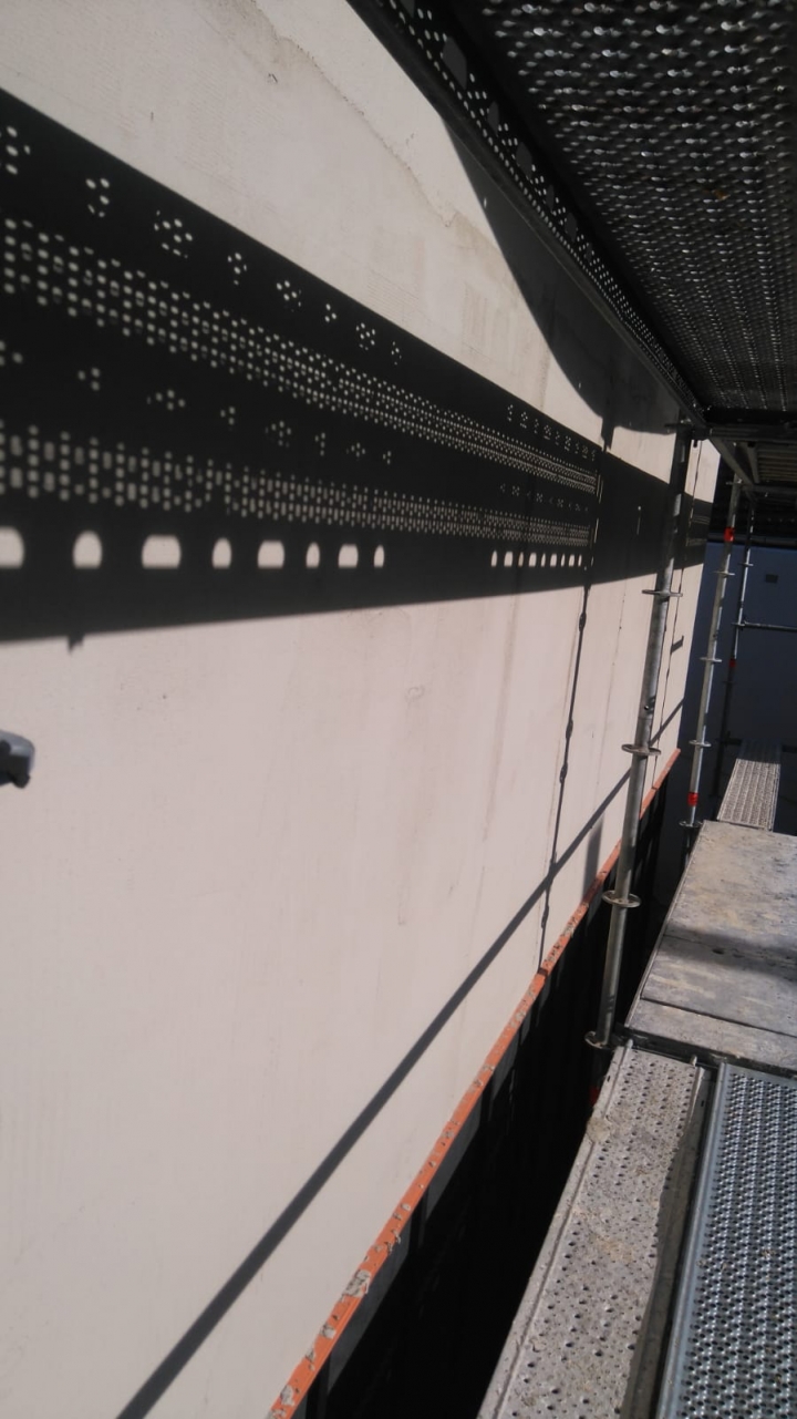 Crépi en cours, Goussainville Nous avons commencé la partie de façade prévue en crépi: le mortier adhésif est en cours sur sur les panneaux fibre bois. Le crépi sera avec une base de silicone, structuré librement, d’aspect taloché, D=1,5mm.