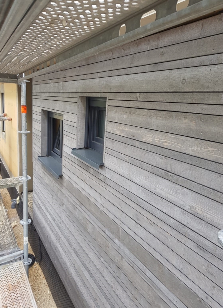 Bardage en épicéa nordique, brut, peint argenté, vis inox.
