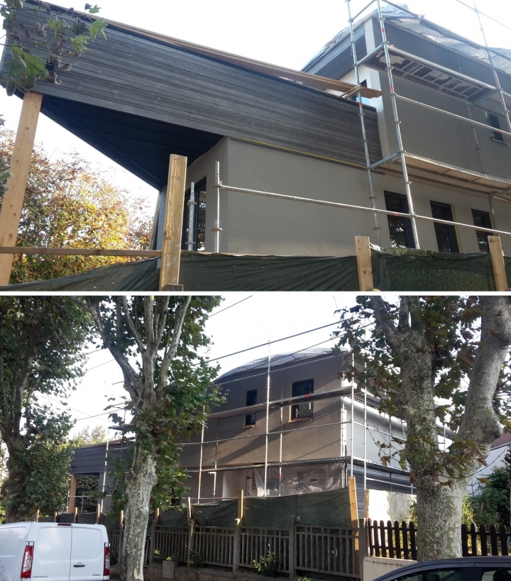 La façade est finie: moitié en crépi, moitié en bardage argenté.
