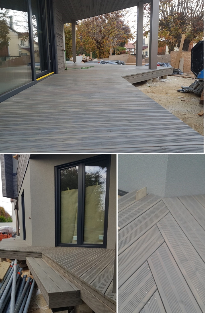 Terrasse en mélèze de Siberie, huilée, lames croisées.