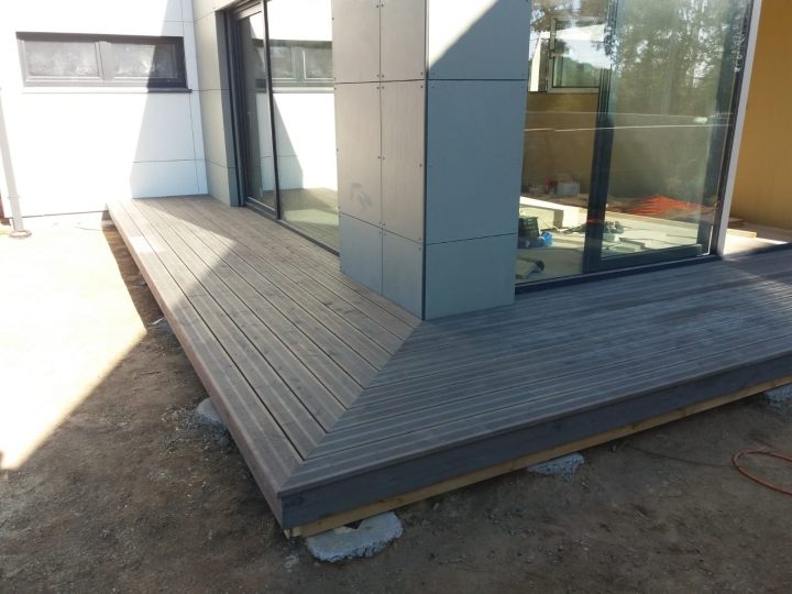 Terrasse en mélèze de Sibérie, Questembert Nous sommes revenus sur le chantier à Questembert pour faire une terrasse en mélèze de Sibérie, argentée.