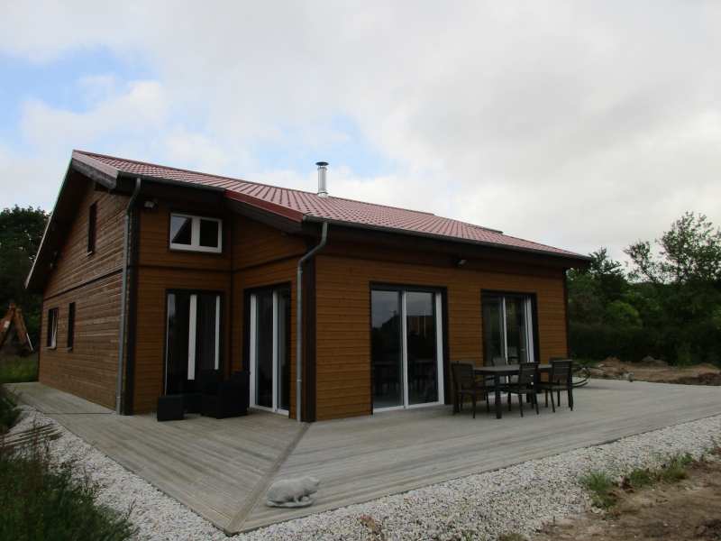 Ossature bois, bardage en épicea nordique, fenêtres alu et bois-alu