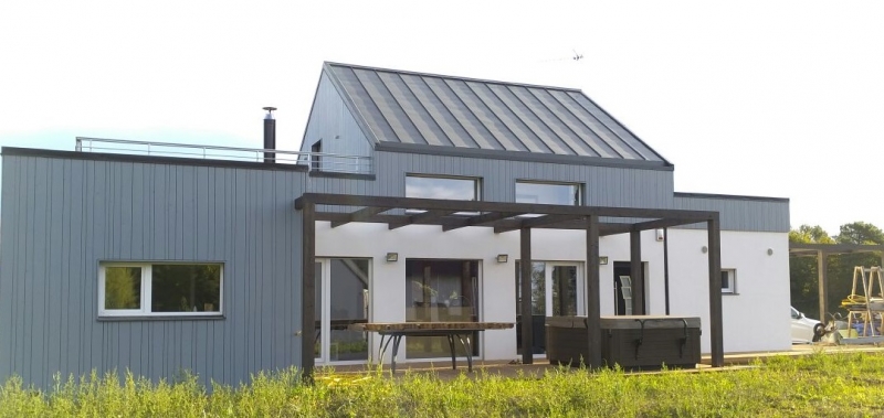 Monterblanc, France Une maison individuelle en ossature bois, en panneaux préfabriqués, passive, fenêtres PVC, bardage en épicéa nordique. Ce chantier nous avons construit pour notre partenaire/ promoteur en Bretagne.