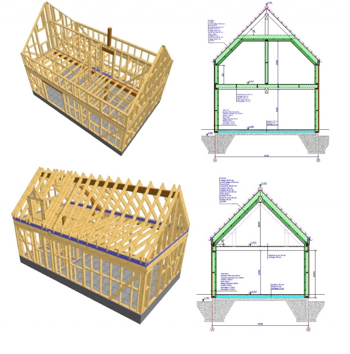 Chantier de deux maisons dans les Pyrénées Nous démarrons le chantier dans les Pyrénées: deux maisons en bois avec des fenêtres et volets en bois, façade en crépi.
