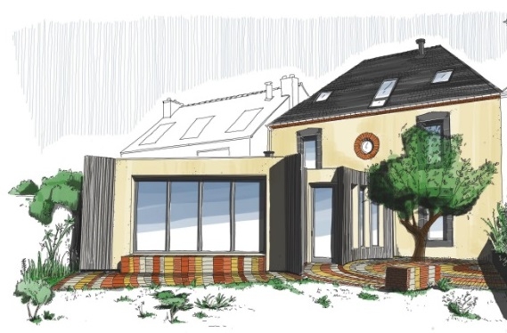 Extension à Séné, Bretagne Une autre étude en cours, pour une extension en Bretagne: murs courbés, fenêtres triple vitrage, finition en mélèze claire voie.