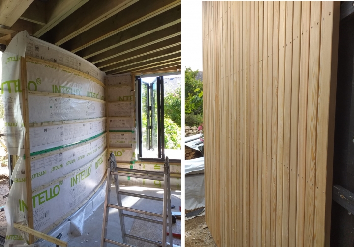 Fenêtres accordéon, pare-vapeur INTELLO, bardage en mélèze de Sibérie sans noeux.
