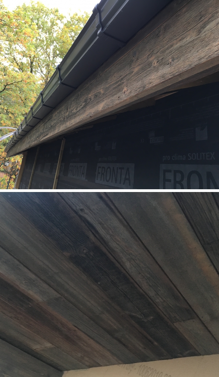 Planches de rives et corniche en bois ancien, Yvelines Les planches de rive et la corniche est en bois ancien récuperé, huilé en deux teintes.