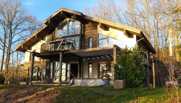Façade en cours, Yvelines En 3,5 mois nous avons construis les trois niveaux, posé la couverture, posé les fenêtres, et le placo est presque fini. Il reste la façade à finir, qui est prévu en bois ancien, crépi et pierre.