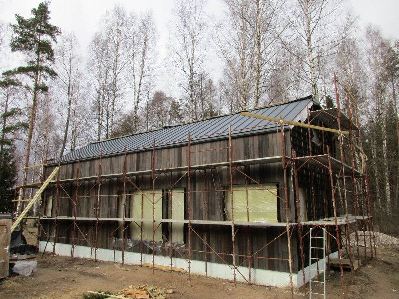 Nous venons de finir la façade en bois ancien pour notre construction en bois en Lettonie. Le bois de bardage était récupéré des anciennes maisons en madrier, et les planches étaient rabotées et huilées. Chaque planche a une largeur différente. Le pare pluie derrière est noir, et le lattage était peint en noir aussi. Vous êtes les bienvenus à visiter le chantier - il est toujours en cours.