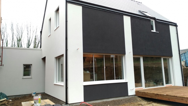 Nous avons fini notre chantier à Elven en 2,5 mois. Toute la structure bois était construite sur place. Nous avons posé le crépi, double placoplâtre, fenêtres et stores, et même le carrelage. La maison a passé le test d'étanchéité avec 0,072 Q4Pa-surf. La performance thermique de la maison correspond aux normes d'une maison passive.