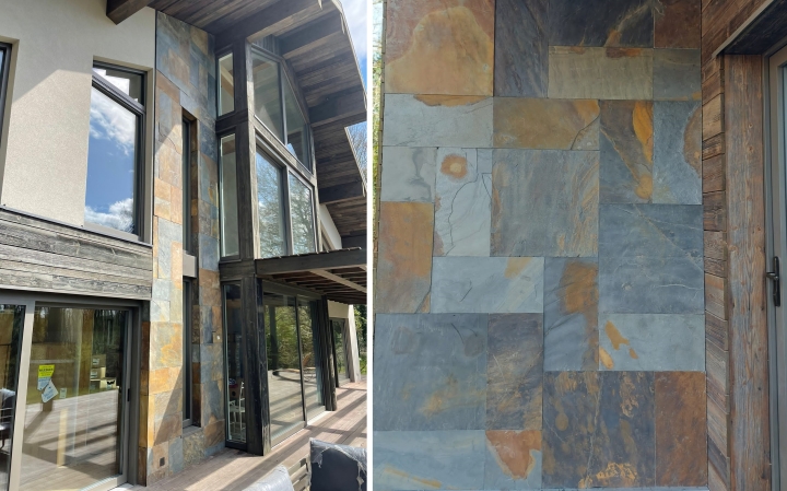 La façade finie en bois ancien, crépi et ardoise rouillé.