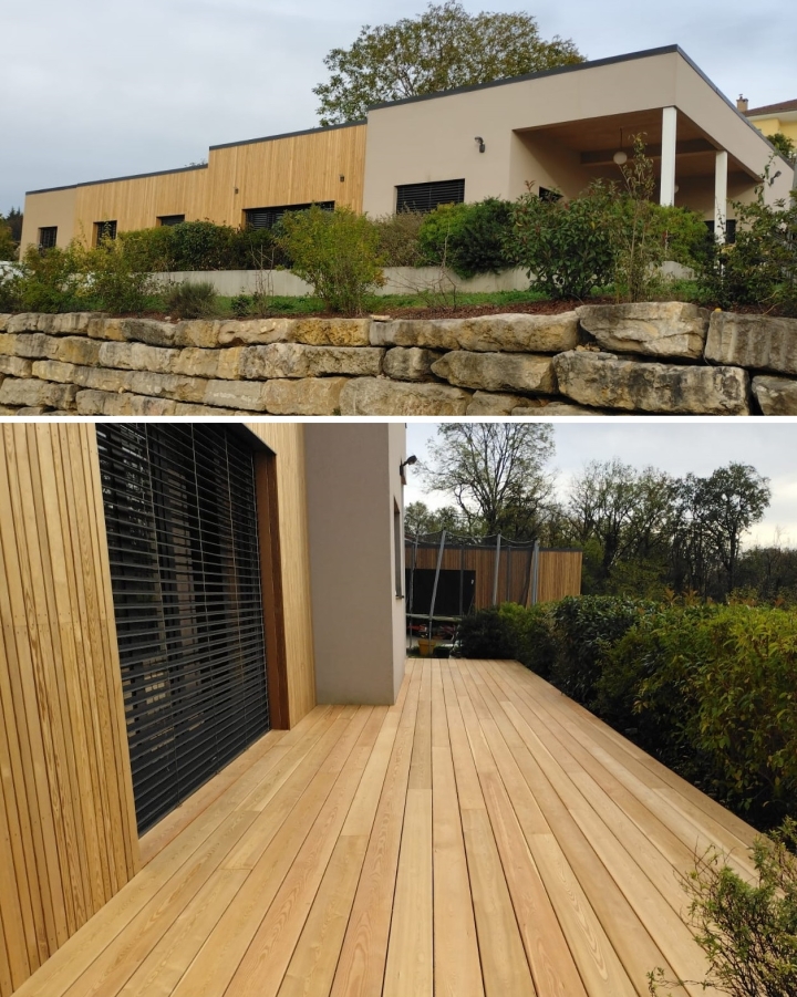Habillage de la façade, Bourg-en-Bresse Habillage de façade existante avec bardage thermo-chauffé sans noeux. Terrasse en mélèze sans noeux, posée sans vis apparentes.