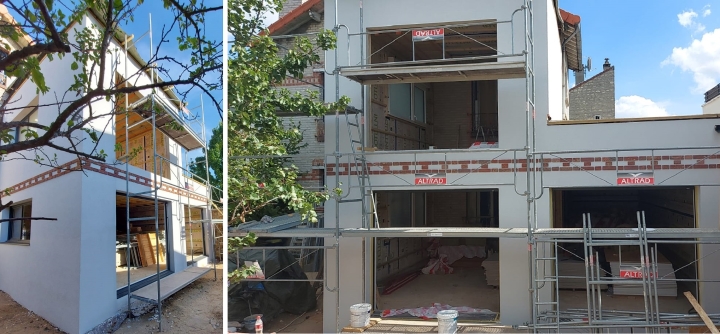 Extension finie, Colombes Extension finie: façade en crépi et brique, isolation en fibre bois et laine de roche, pare vapeur INTELLO et sous-toiture SOLITEX 3000.