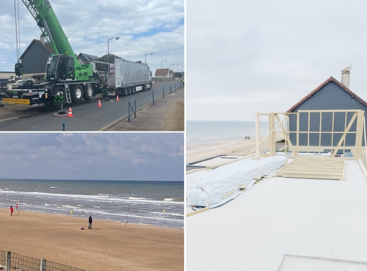 Démarrage de chantier, Villers-sur-Mer Une maison ossature bois au bord de la mer, prévue avec des fenêtres alu et façade en crépi.