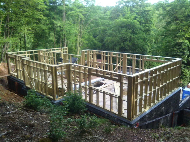 Ham-sur-Heure, Belgique En trois jours ouvrables nous avons construis la structure poteuse de 1e étage. L'ossature est construite en épicéa nordique, traité en autoclave, tout le bois utilisé est classé C24.