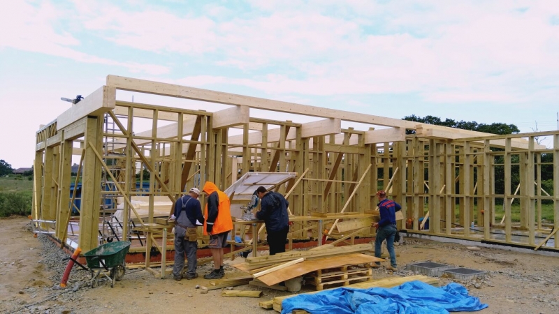 Nous avons commencé notre chantier de 400m2 en lamellé-collé pour notre partenaire en Bretagne. Le RDC avec la structure lamellé-collé était construit en deux semaines par nos 4 hommes. Le poteau le plus long fait 12m, et l'épaisseur des poteaux va jusqu'à 40cm.