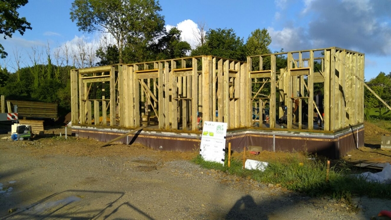 Ossature bois à Surzur, France Une maison individuelle en ossature bois: la structure porteuse de RDC était finie en une semaine par 3 hommes. Tout le bois utilisé est autoclave, classé C24.
