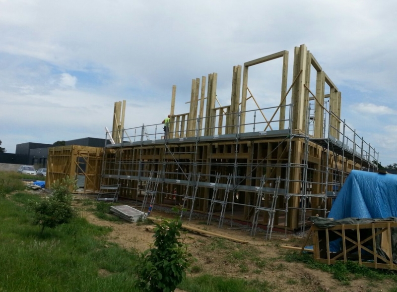 L'étage de bureau se monte Nous avons commencé l'étage de notre plus grand chantier. Toute la construction porteuse est faite en pouteaux lamellé-collés, et les façades sont vitrées à 80%.